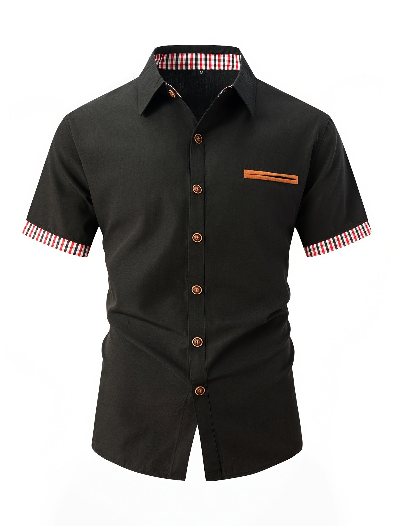 Verbessern Sie Ihren Stil mit unserem Herren-Kurzarmhemd in einem edlen Grauton. Entworfen für Büro und Freizeit, verfügt es über eine dekorative Brusttasche für zusätzlichen Stil und Eleganz. Hergestellt aus hochwertigen, atmungsaktiven Materialien bietet dieses Hemd außergewöhnlichen Komfort, ideal für Sommertage. Sein strapazierfähiges Gewebe und moderne Details wie die kontrastierend gefütterten Ärmel machen es zu einer trendigen und praktischen Wahl. Ob eingesteckt oder lässig getragen, ist es vielseitig und mühelos stilvoll, ideal für jede Gelegenheit.