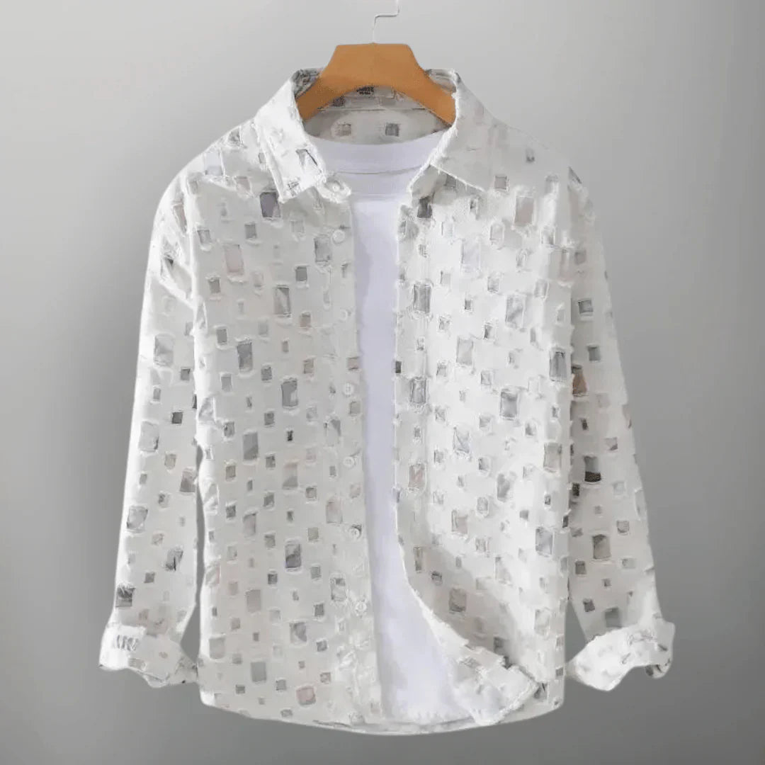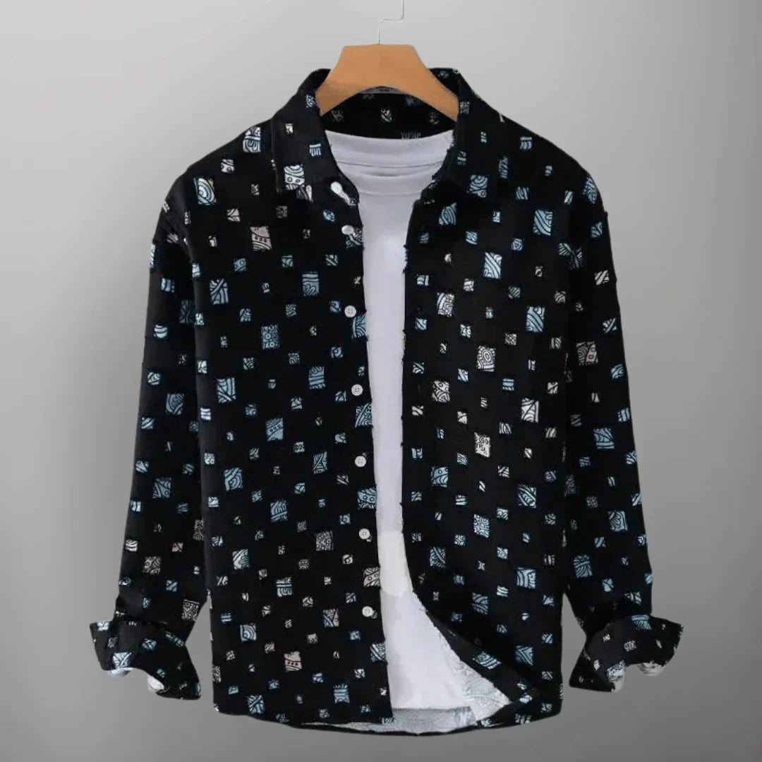 Verleihen Sie Ihrem Look mit dem Herrenhemd mit Kragen und Mosaikmuster das gewisse Etwas. Ideal für alle, die ein Statement setzen möchten, kombiniert dieses Hemd robuste Eleganz mit raffinierten Details. Inspiriert vom urbanen Stil, richtet es sich an den modernen Mann, der Individualität und Stil schätzt.